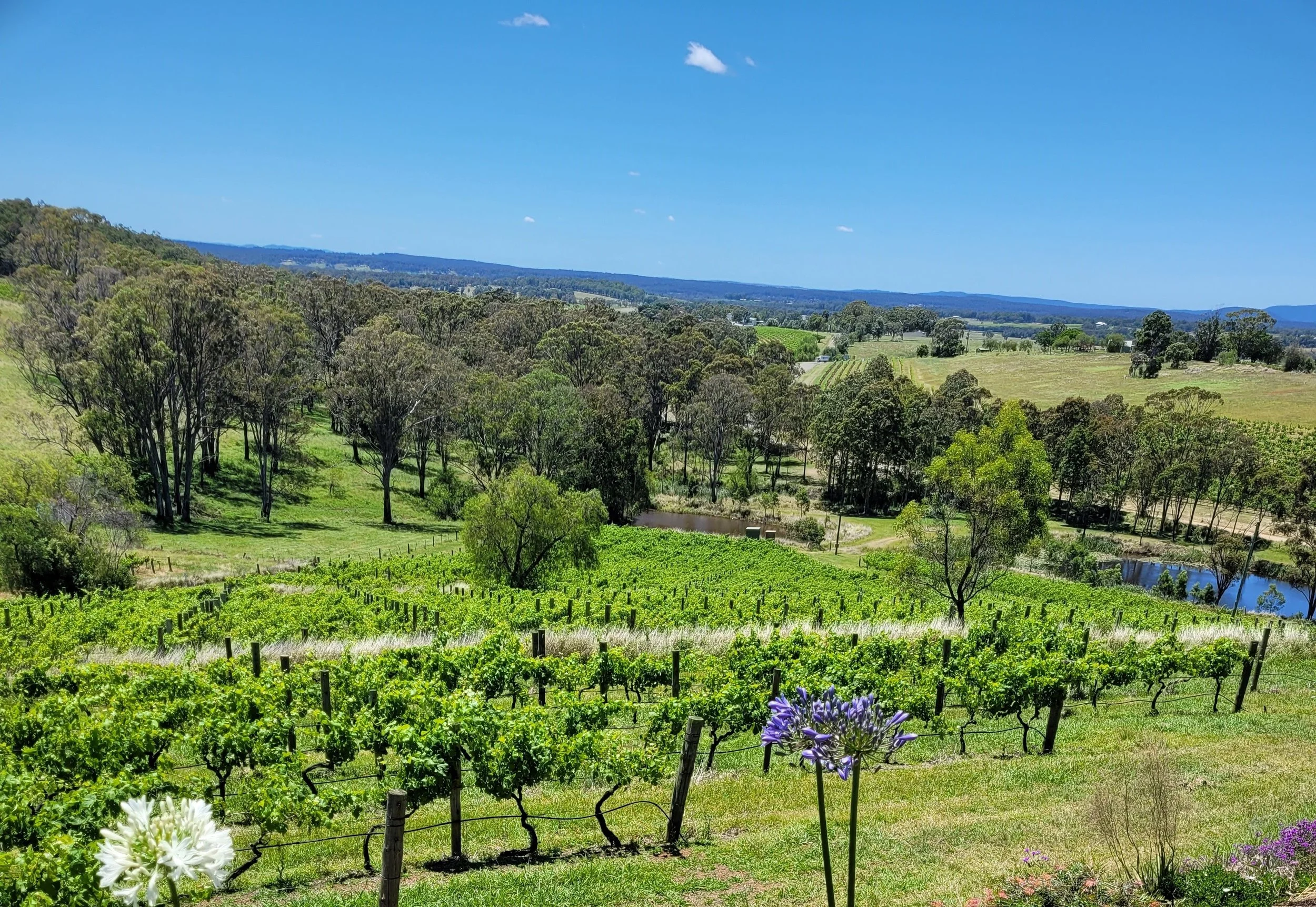 On arrival at Mistress Block Vineyard you will wind your way up the tree lined hill to be greeted by spectacular views stretching over local vineyards and across the Hunter Valley to the coast.
